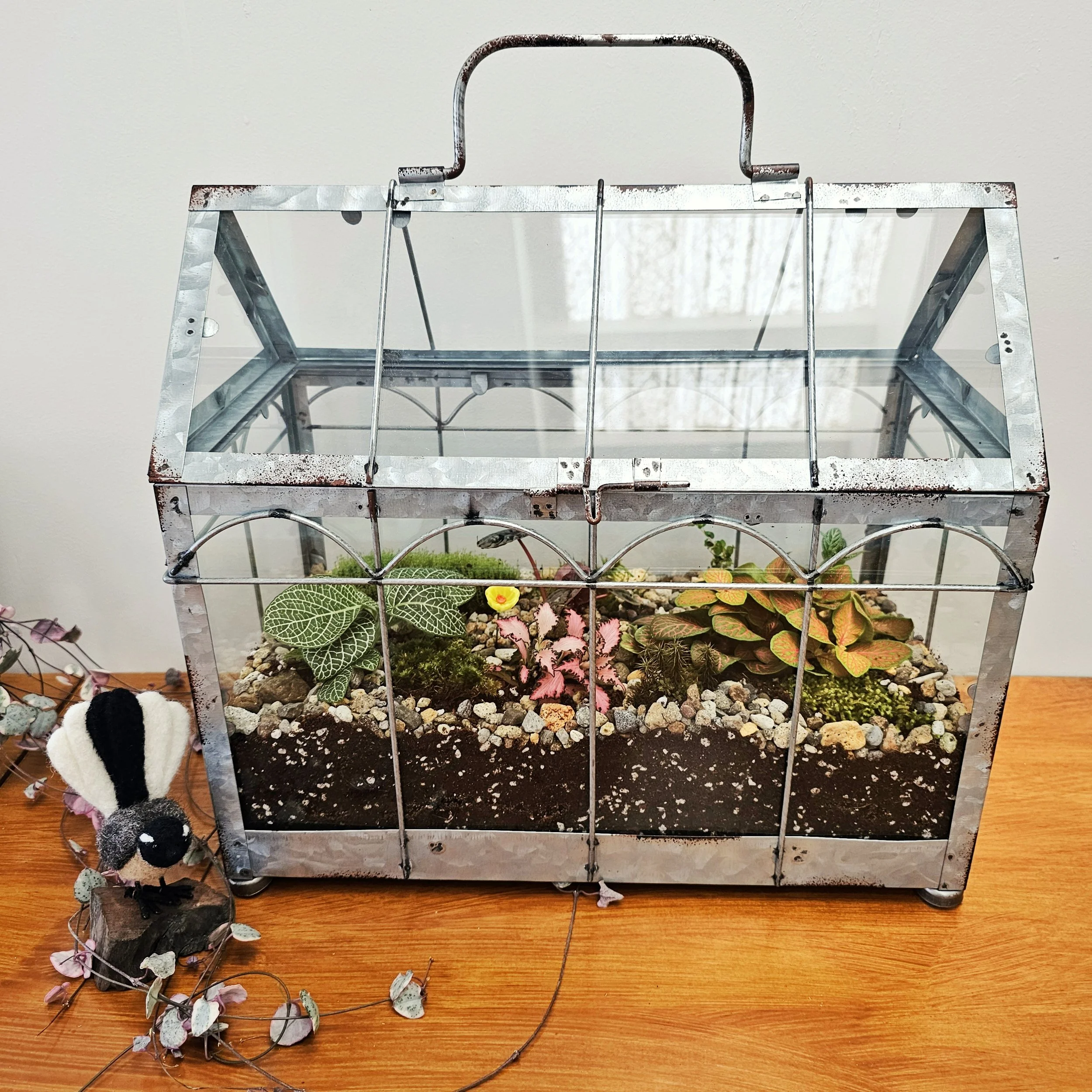 This wardian-case inspired Terrarium takes us back to the origin of Terrariums, when they were used to transport rare plant specimens around the world. This version is the largest of the two sizes and houses a range of tropical plants and mosses and is easy to maintain with a lid that lifts open. Low maintenance, this Terrarium will need pruning only every few months. It is not 100% air tight, so may need a little mist of water every couple of weeks, or longer. Comes with a care card and plants may vary. Approximately 35. 5cm Length, 32cm High (with top handle down) and 18cm wide.